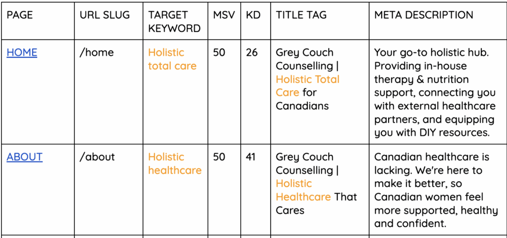 Start by making a list of topics relevant to your business, then use these tools to find specific keywords within those topics. After that, assign specific keywords to specific pages on your website. Your homepage might target your main, broad keyword, while category pages target medium-specificity keywords, and individual blog posts or product pages target long-tail, highly specific keywords. Like this: