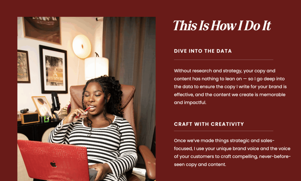 In the past 4 years, I’ve cut my teeth strategizing & writing award-worthy, revenue-increasing, results-snatching copy. And what really lights my fire is writing for woman-owned and BIPOC-led brands. I’m talkin’ the first day after a braiding appointment type of excited! Energizing them to go big with their bold ideas so that when launch time happens, the world thinks “OMG FINALLY, I’ve been waiting for something like this.” And giving them the tools to diversify the market.